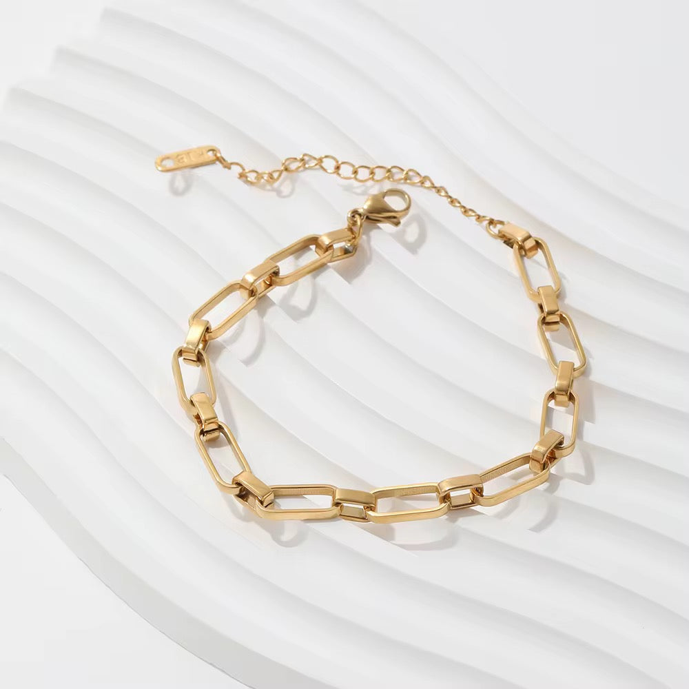 The Gold Link Bracelet is a stylish and classic addition to any outfit. Made with durable stainless steel and coated in gold, it features a unique geometric pattern design that adds a touch of sophistication. With a length of 17.5cm + 5cm, it's the perfect fit for any wrist. Elevate your look with this elegant accessory.